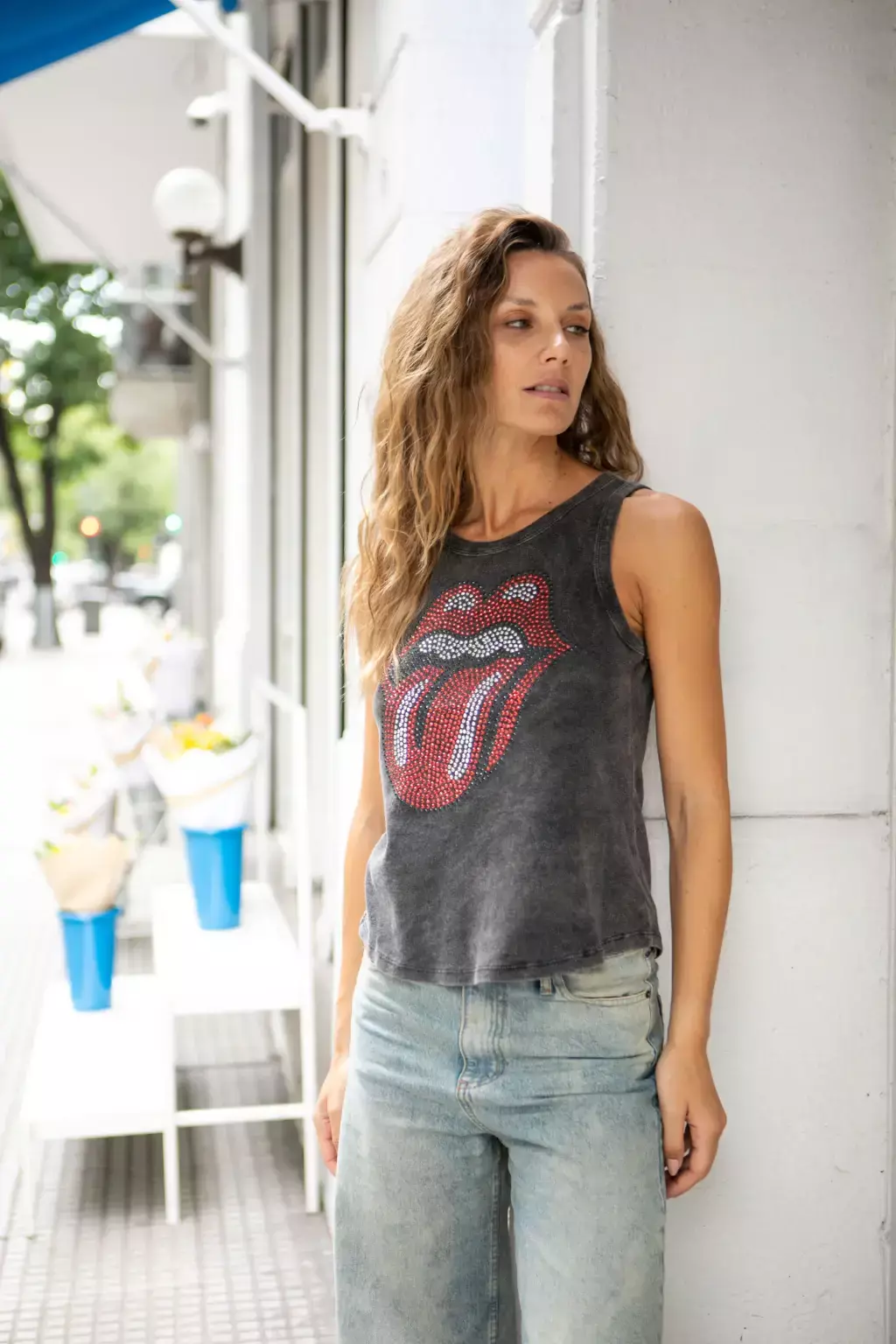 Musculosa basica realizada en morley algodon pre lavada con aplique de strass en delantero.